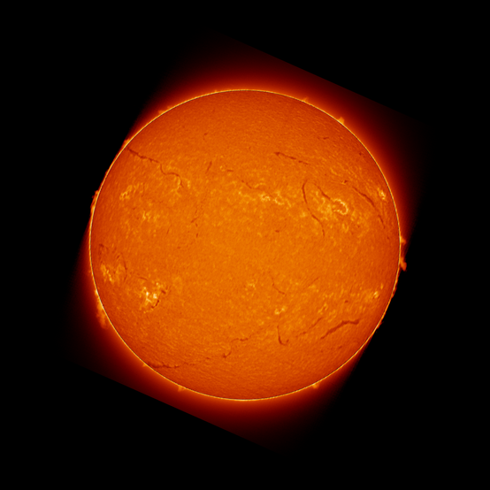 Après une longue pause, ce matin ciel très agité mais tout de même vers midi une belle éclaircie. Quelques rafales, mais le Sol'Ex tient bon et les images montrent que l'astre du jour est encore bien actif ! Malheureusement les nuages sont de retour avant que j'aie eu le temps de faire le réglage pour enregistrer les images dans les raies du calcium.